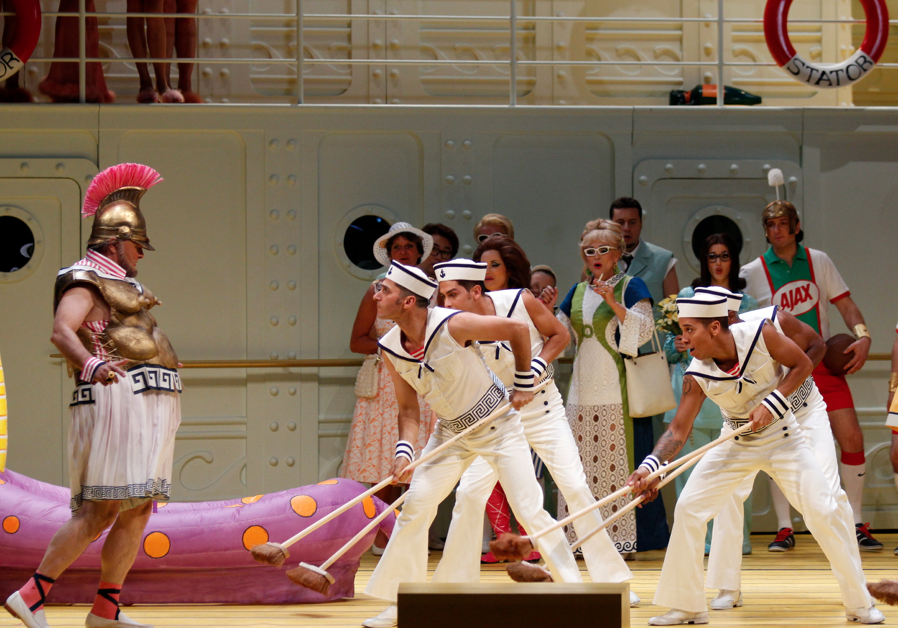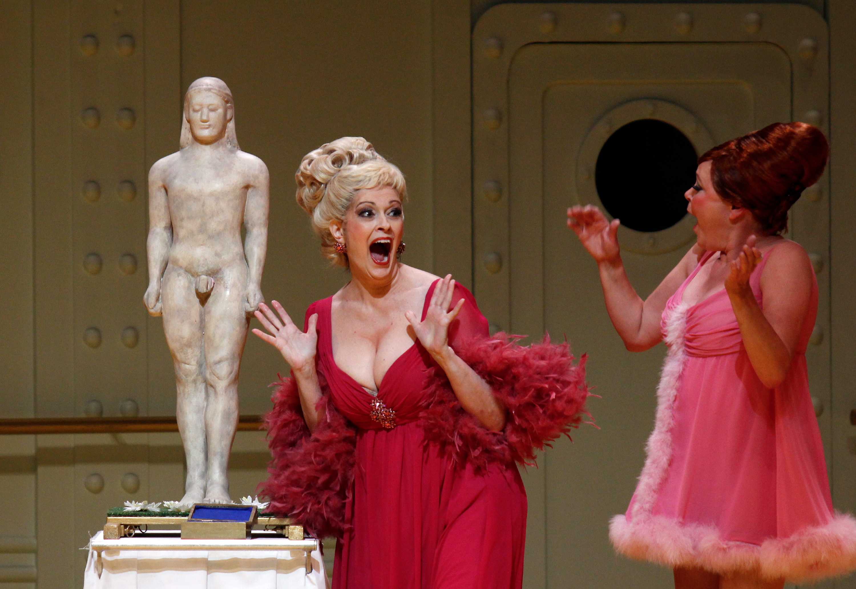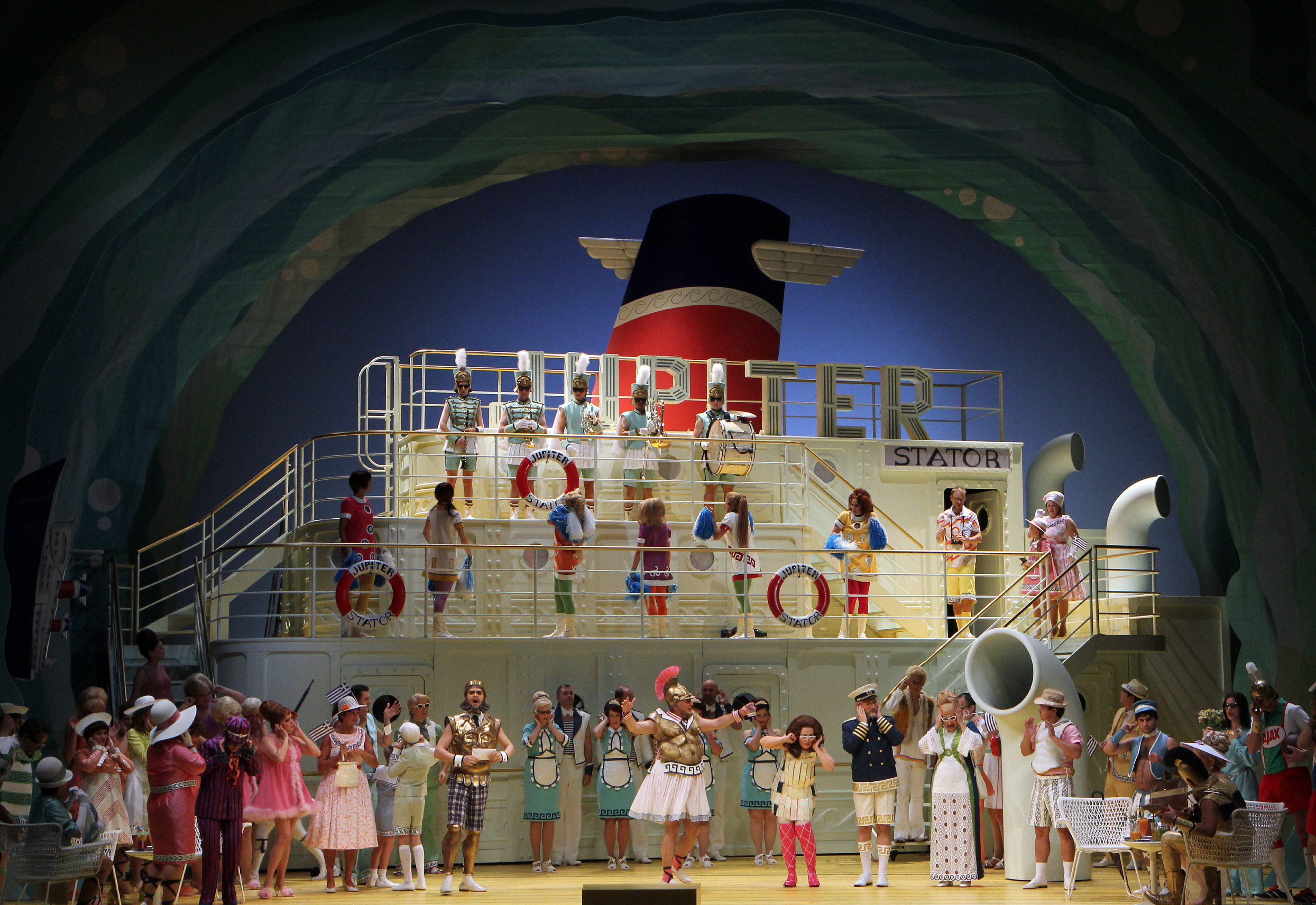 Das franko-kanadische Produktionsteam André Barbe und Renaud Doucet hat die Handlung von Jaques Offenbachs Opéra bouffe „La Belle Hélène“ für die Hamburger Staatsoper in die Moderne geholt – an Bord eines Kreuzfahrtschiffes Ende der 60er Jahre. Ein kleinbürgerliches Paar, Hélène und Ménélas, verbringt dort seine Ferien. Doch der Ehemann zeigt weit mehr Interesse am Kauf kitschiger pseudoantiker Statuen als an seiner Frau. Als ihr daraufhin eine Gipsstatue von Adonis auf den Kopf fällt, träumt sie, sie sei die schöne Helena, die verführerischste Frau der Antike. Ein Traum jedoch, in dem spießige Rituale an Bord des Kreuzfahrtschiffs durch rauschenden Flower Power aufgemischt werden: ein amüsantes Feuerwerk der Intrigen…
